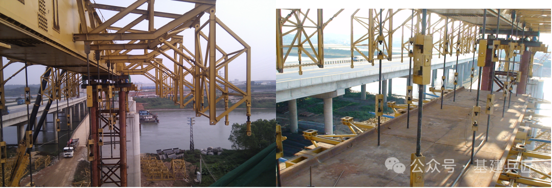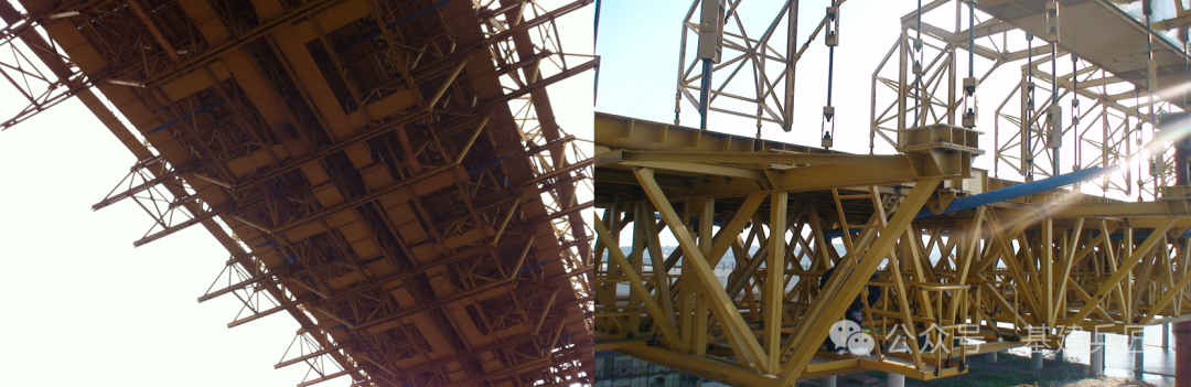 底模架及模板安装,底模是箱梁混凝土的直接支承及成型体系,而底模架则是底模的受力桁架,通过桁架传力→吊杆→主梁。如图10所示
