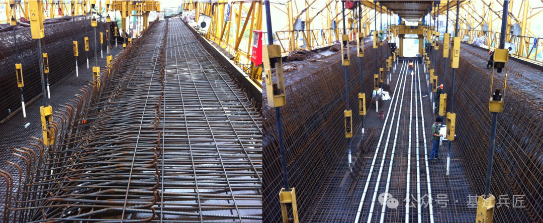 钢筋绑扎按设计及施工规范要求进行,在箱梁腹板钢筋绑扎接近完成时,要按设计图要求的位置,绑扎纵向预应力束管道定位筋,然后安装管道。管道要平顺,接头部分要用大一号波纹管套接,用胶带纸裹紧。定位钢筋要编号,并与箱梁模板号相对应,其焊接位置由管道坐标计算而定。