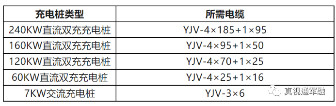 而从变压器到充电桩的需要多大电缆需根据充电桩的所需要电流计算需要的电缆,这里直接列出充电桩常用的铜芯电缆如下: