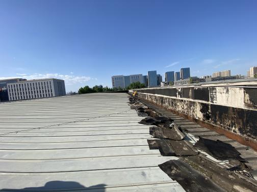 拆除檐沟内部以及女儿墙内侧所有老旧防水层,直至露出锈迹斑斑的彩钢基层和女儿墙结构墙体。
