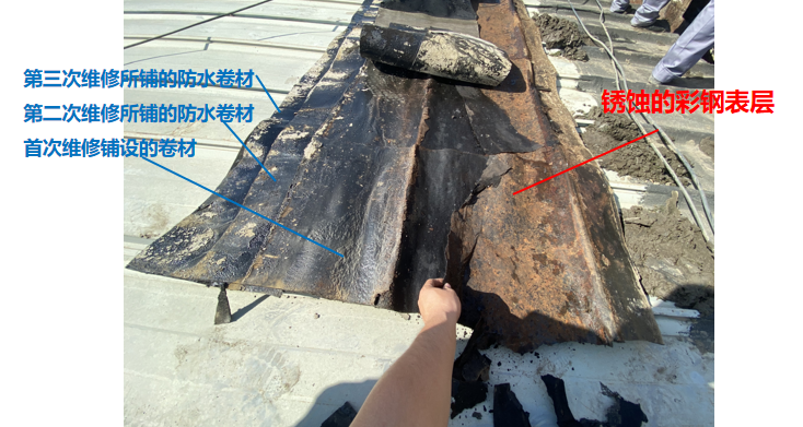 拆掉的防水层细心观察,可发现,一层层防水卷材如同大树的年轮一样记录着一次次失败而惨痛的防水维修历史。