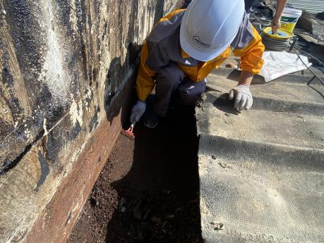 铲掉金属檐沟以及边缘墙体表面残留的沥青层和污染物,最后将垃圾清理干净。