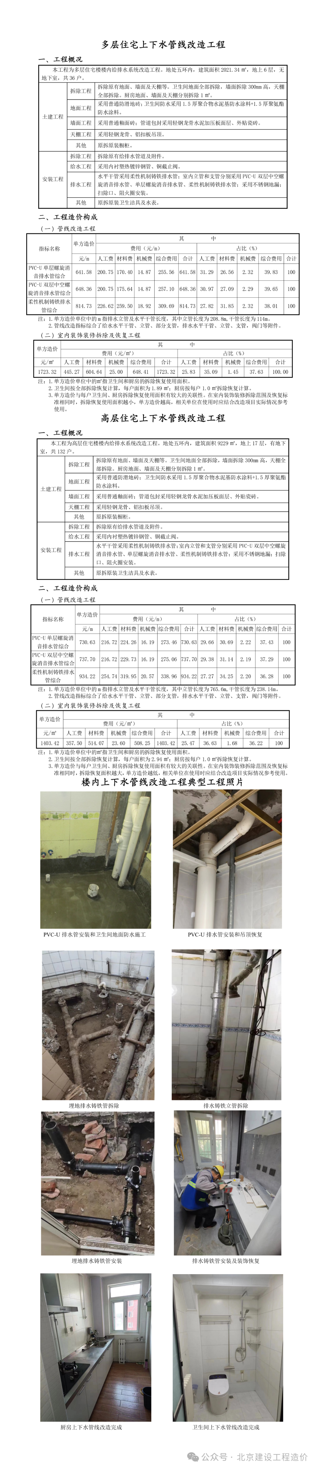 一、《北京市城市更新工程造价指标——老旧小区楼内上下水管线改造工程》(以下简称本指标)主要适用于我市老旧小区多层、高层住宅楼内共用上下水管线改造,可作为投资控制的参考。