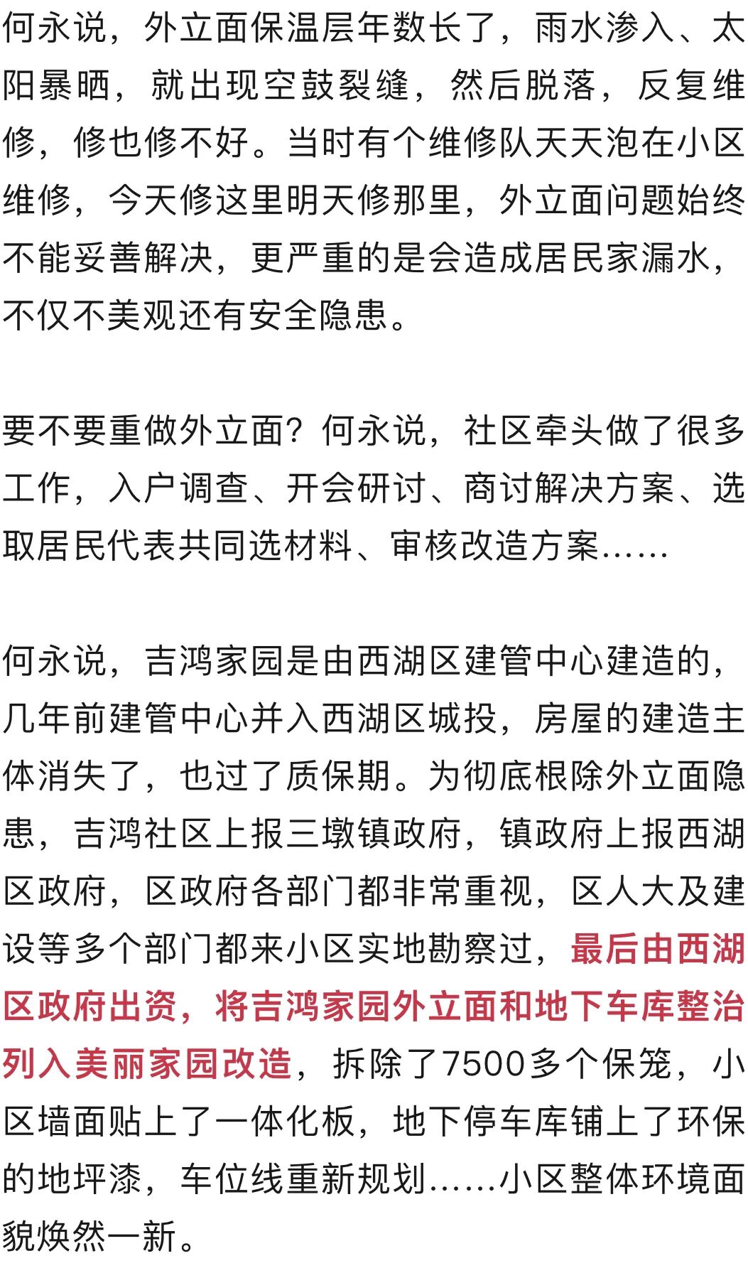 何永说,和景苑、临秀苑、望昕苑的外立面重做分3个标的进行,同步施工,2019年7月动工,半年完成,项目耗资6000多万元。居民的保笼是通过费用补偿的方式拆除的,按面积补偿,这笔费用没算在外立面项目中,是由杭州吉鸿股份经济合作社另行出资的。