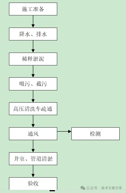 使用泥浆泵将检查井内污水排出至井底淤泥。将需要疏通的管线进行分段,分段的办法根据管径与长度分配,相同管径两检查井之间为一段。