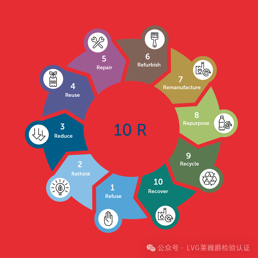 循环经济的10R原则包括Refuse(R0),Rethink(R1)、Reduce(R2),Reuse(R3),Repair(R4),Refurbish(R5),Remanufacture(R6)、Repurpose(R7),Recycle(R8)及Recover(R9)这些原则指导着循环经济的实施路径。循环经济以减少对自然资源的依赖为核心,通过确保产品多次重复使用、材料循环利用,实现资源和能源的有效利用。