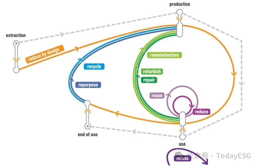 循环经济是一种社会经济增长方法,它通过可持续的生产和消费,最大限度提高资源使用效率,确保原材料和产品保持最高价值。循环经济层次结构如下: