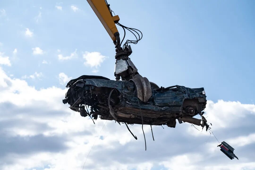 在法国的一个废料场一台爪式起重机正在吊起一辆被压坏的汽车