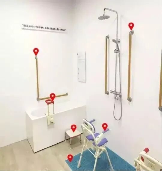 3、老年卫生间淋浴隔断应采取软质隔断,淋浴上方设淋浴安全带。淋浴间应设淋浴凳或洗澡椅。