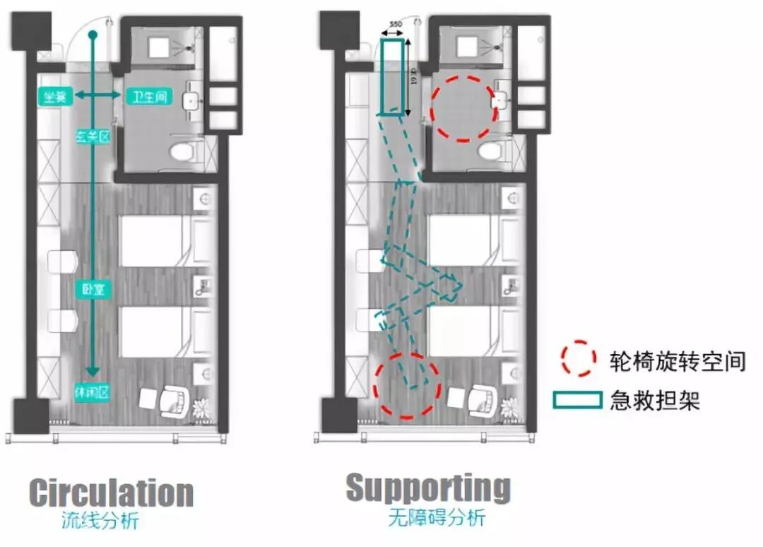 8、老人卧室进门处不宜设狭窄的拐角,以免急救时担架出入不便。
