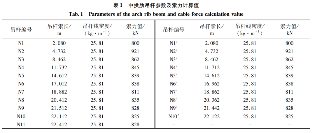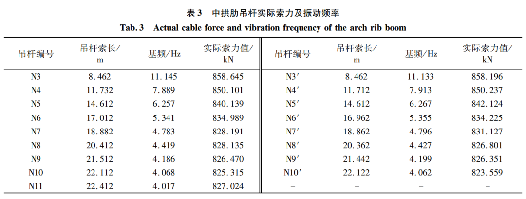 通过上节分析,现场将索力测试仪放在吊杆的L/6~L/4处进行实测。并通过下锚头预设压力环现场采集每一组吊杆实际索力值。因吊杆N1、N2、N1’、N2’索体长度均较短且索力测试仪实测吊杆频率不稳定,故本文选取吊杆N3~N11及N3’~N10’为索力研究对象,中拱肋吊杆索力及基频实测值见表3。