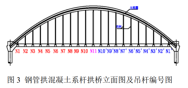 钢管混凝土系杆拱桥是梁-拱组合受力结构,其充分发挥拱肋受压及系梁受弯的力学特性,使得桥梁结构受力更为合理且节省施工成本[1]。其中,吊杆在梁-拱组合结构中起到连接和传力的关键作用,吊杆结构受力是否均匀直接关系到桥梁结构受力是否合理,因此准确的对吊杆索力进行分析是十分重要的。