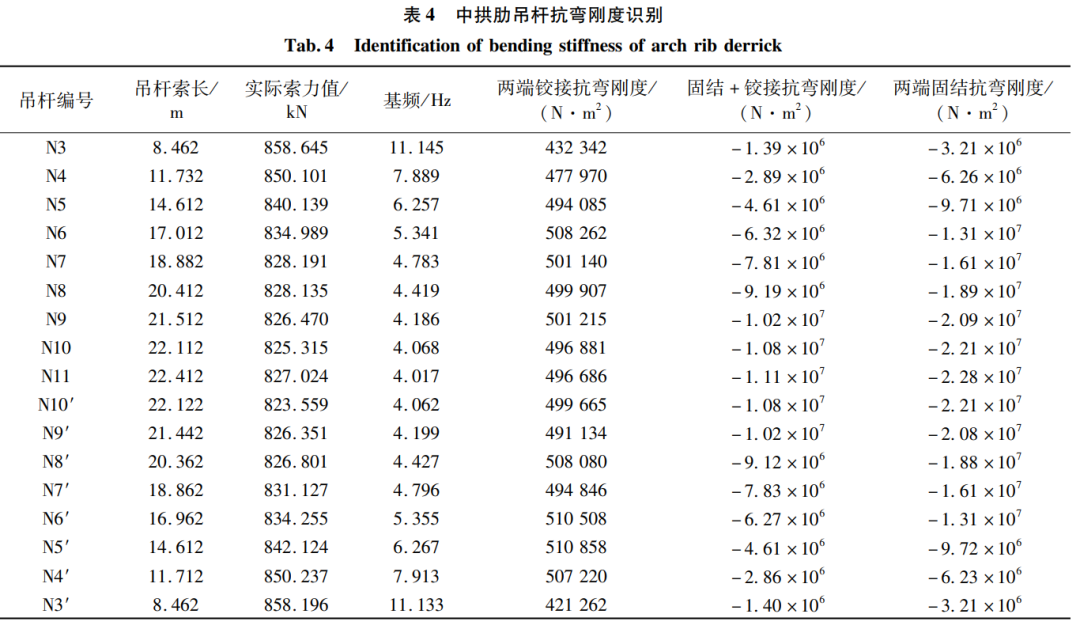 将表3实测数据带入第1节推导的柔性吊杆索力公式(8)、(10)、(12)进行反算识别,分析主桥吊杆索力两端约束形式。因吊杆处于竖直状态,故不再考虑吊杆倾角修正项。吊杆抗弯刚度计算结果见表4。