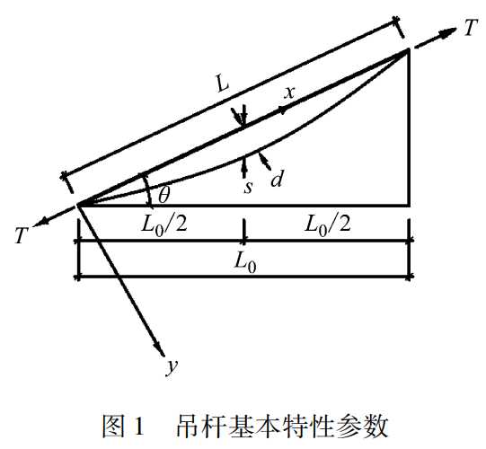 取任意倾斜柔性吊杆拉索放置在以拉索为X轴和垂直于拉索为Y轴的直角坐标系下。吊杆基本特性参数见图1。