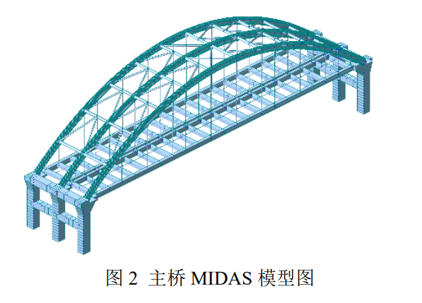 主桥采用MIDAS CIVIL进行建模模拟(共计538个节点、718个单元、46个节点弹性连接、8个弹性连接、52个刚性连接及177个一般支撑模拟。其中,主拱、纵梁、横梁、墩柱采用梁单元,吊杆、系杆采用桁架单元。)