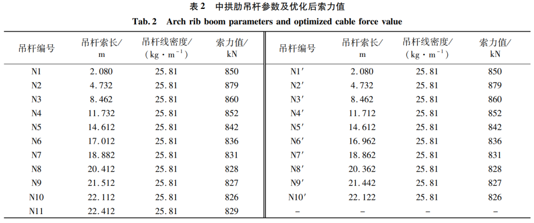 (1)应用能量法推导的索力公式是可行的。通过应用未知荷载系数法对索力进行优化,使得吊杆索力更为均匀、系梁位移更加合理。为施工阶段索力张拉及施工监控内力、位移数据监控提供基础,为同类桥型吊杆索力优化提供参考价值。