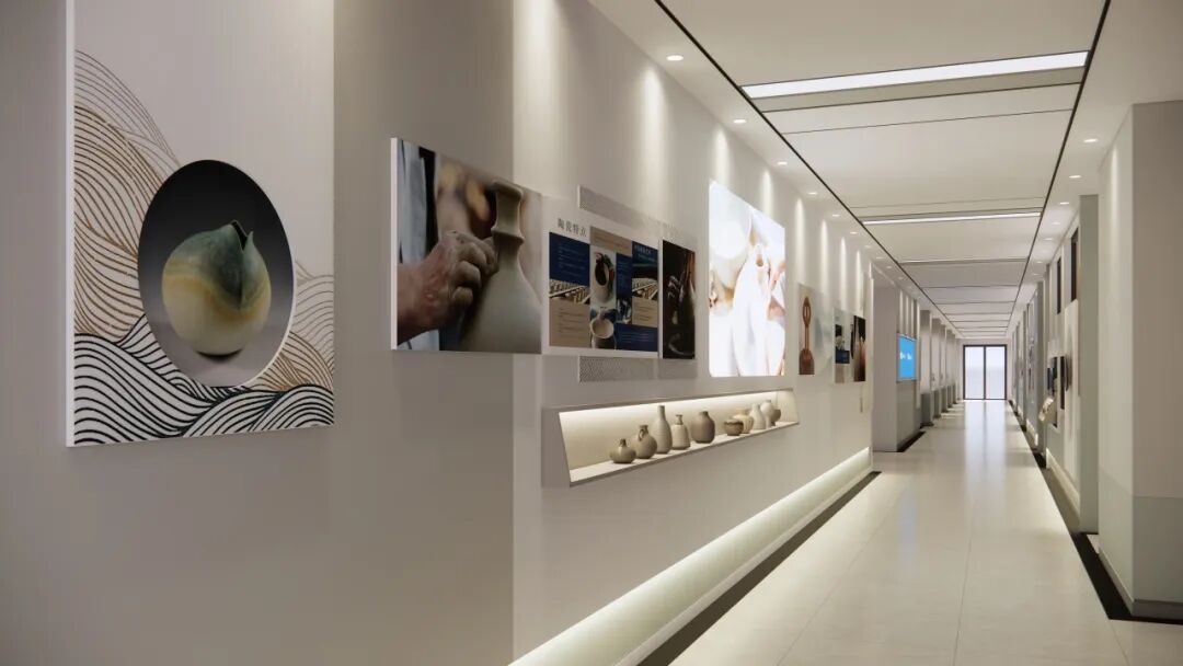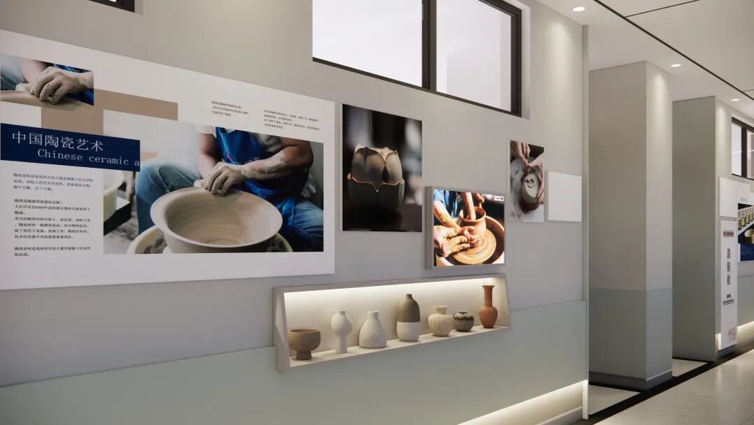 在特定墙面,我们精心设计了悬挂点和展示架,可以错落有致地展示师生创作的陶瓷作品。两侧墙面则简明扼要地介绍陶瓷的历史、工艺与材料,让观众迅速领略陶瓷文化的深厚底蕴,展示唐山作为“北方瓷都”的独特魅力。