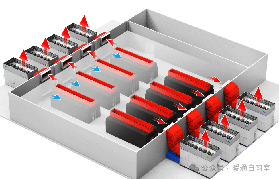 通风与气流组织:合理的通风和气流组织可以确保机房内的空气分布均匀,避免出现局部过热或过冷的情况。暖通工程通常会采用下送上回的送风方式,即冷空气从机房底部送入,吸收设备产生的热量后从顶部排出。