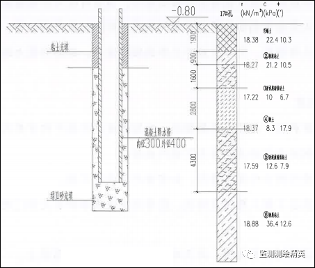地下水位监测可采用钢尺水位计,钢尺水位计的工作原理是在已埋设好的水管中缓慢向下放入水位计测头,当测头接触到水面时,启动讯响器,此时读取测量钢尺在管顶位置的读数,每次读取管顶读数对应的管顶位置应一致,并固定读数人员。在基坑开挖前测得各水位孔孔口标高及各孔水位深度,孔口标高减水位深度即得水位标高,初始水位为连续三次测试的平均值。根据管顶高程、管顶与地面的高差,即可计算地下水位的高程和埋深。