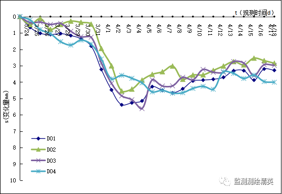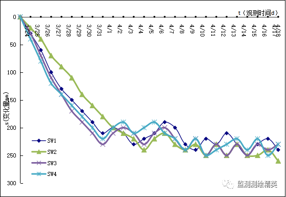 坑外地下水位监测孔及地表沉降监测点在2022年3月15日布设完成。坑内降水井在3月23日全部布设完成,本工程从2022年3月24日开始正式抽水,至4月18日各项监测数据如下:
