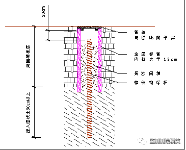 监测点布设时穿透路面结构硬壳层,沉降标杆采用Φ20mm螺纹钢标杆,螺纹钢标杆深入原状土60cm以上,沉降标杆外侧采用金属套管保护。保护套管内的螺纹钢标杆间隙用黄砂回填。金属套管顶部设置管盖,管盖安装稳固,与原地面齐平;为确保测量精度,螺纹钢标杆顶部在管盖下20cm。地表监测点埋设结构如下图所示:
