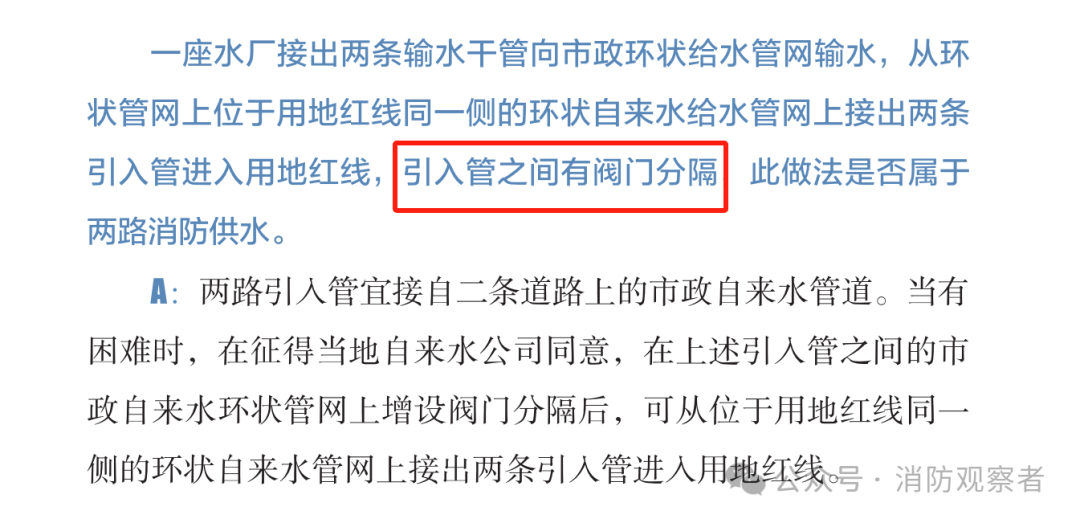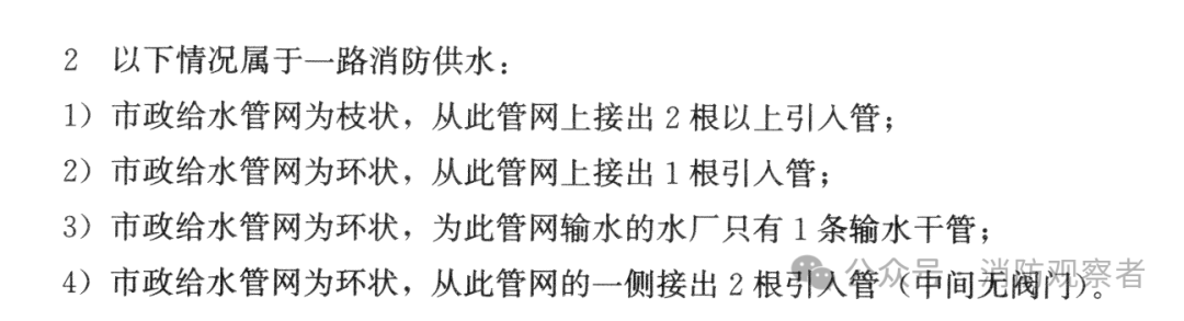 在满足该条文第1、2款的前提下,建筑物若从同一条市政道路上的给水干管引入两条给水管,这种做法是否属于两路消防供水,争议较大。