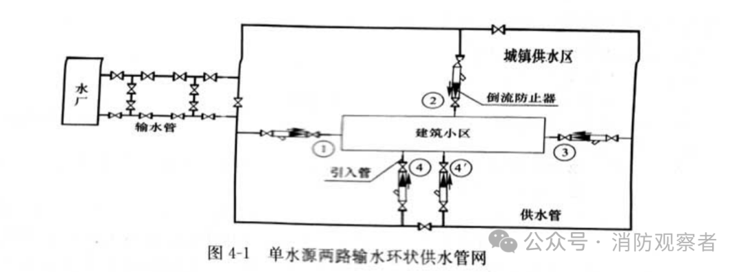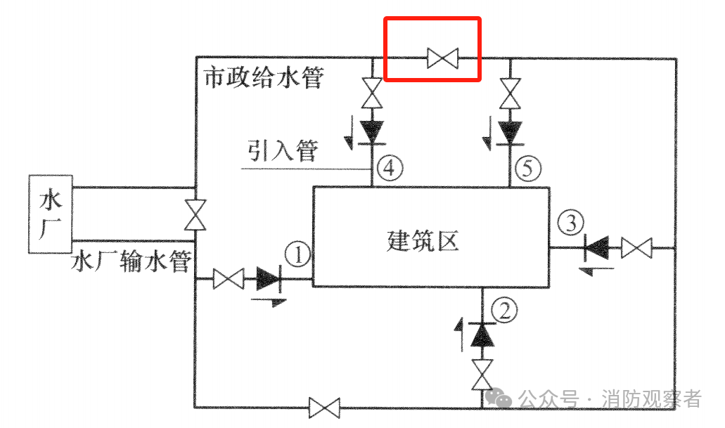 市政环状给水管间的阀门两侧可认为来自两条不同的市政给水干管,即使在同一条市政路上,示意图中引入管①-④任何两条均满足两路消防供水要求;引入管④⑤,只要市政给水管在其接出点之间有阀门,此两条引入管也满足两路消防供水要求。