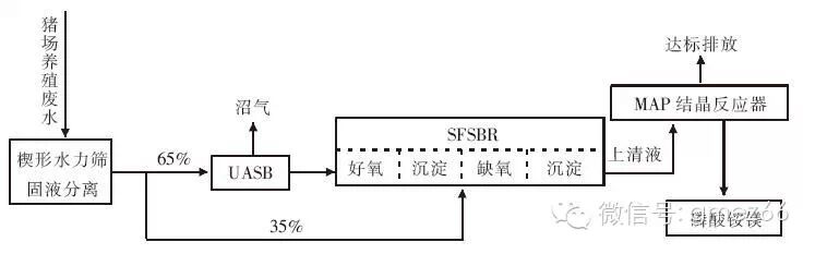 总之,在废污处理问题上,猪场应该以“资源化利用、容量化控制、减量化处理、生态化发展和低廉化治理”为指导原则,不断尝试采用新技术新方法,如浙江省某猪场在固液分离预处理条件下,采用荷兰Lettinga教授于1977年首先提出并不断被改进的“升流式厌氧污泥床—分步进水序批式反应器—反硝化除磷法”(UASB-SFSBR-MAP)处理净化污物,既处理了污水又将废水中的氮磷回收成产品磷酸铵镁,值得推广。该方法采用的技术路线图见图1。