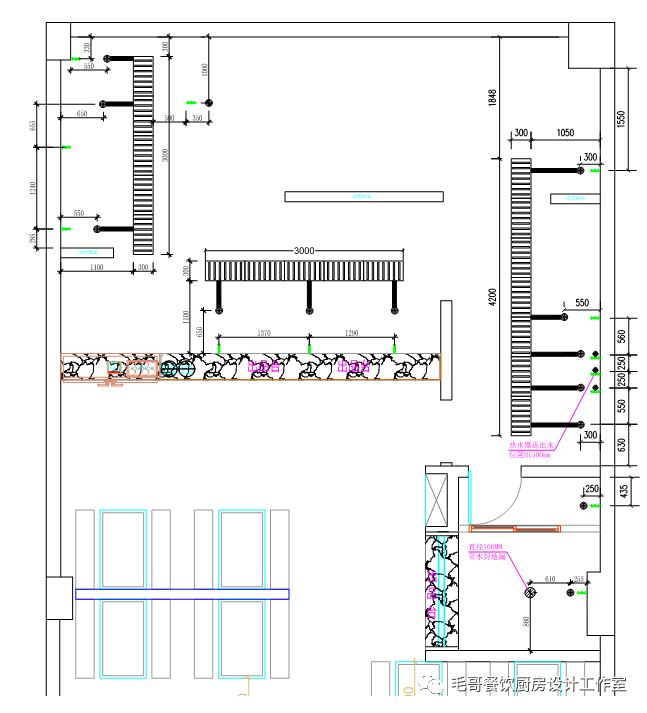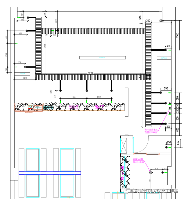 上图我们对照着厨房设备平面布置图和给排水及地沟图,看一下上图排水渠设计为田字形闭环结构,看起来到处都有排水渠,方便打扫卫生和排水。实际上存在以下问题: