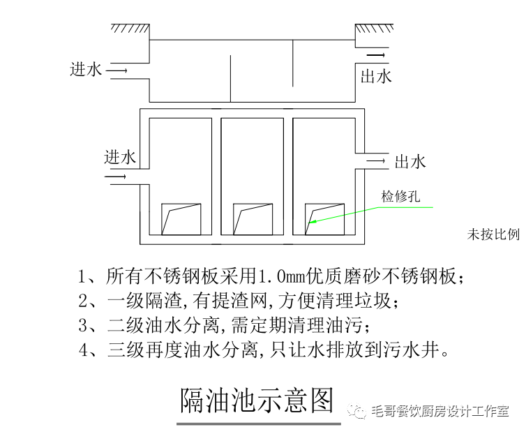 餐饮厨房大部分排水为油性,应配备其他排水系统,并采取油分离措施,并通过隔油池的安装进行处理(特别是火锅店必须设置单独的油水分离装置)。在餐饮的厨房,需要将不锈钢油水分离器安装在餐厅的厨房内。最好在水池内或有下水的设备中设置漏水网(例如:各种水池、炒灶、大锅灶、洗碗机等),堵塞较大的杂物,避免流入管道中堵塞。