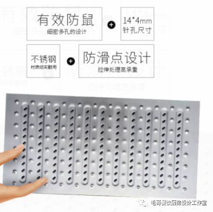 餐饮厨房的明沟不外露,应提供水封等装置。出水口应为网框式地漏或网状物,并被其他物体阻挡。下水道的出口与防鼠金属网连接,下水道围栏由不锈钢或铜制成,不仅防鼠也要防腐(污水有一定的腐蚀性),围栏的栅条不宜过大,防止鼠类通过。