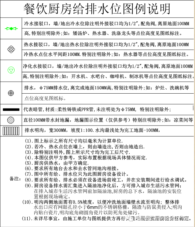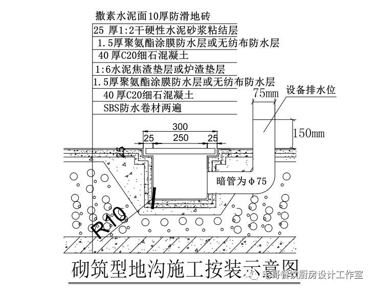 餐饮厨房排水渠是厨房排水系统,一般公共厨房都要设排水渠, 一般深度为200mm-250mm;不做特别说明,可根据厨房建筑结构实际情况,有些建筑层距不允许垫层过高的情况下可调整;或厨房明沟过长、坡度过大需要进行阶梯式设计。