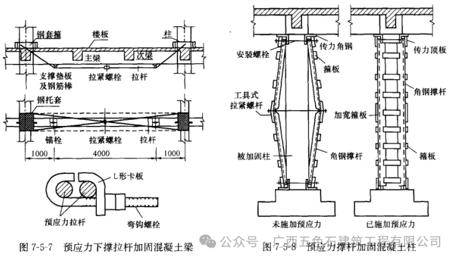 外加预应力法系采用在构件体外加预应力的钢拉杆(分水平拉杆、下撑式拉杆和组合式拉杆三种)或撑杆,对结构进行加固的方法(图7-5-7、图7-5-8)。这种方法适用于要求提高承载力、刚度和抗裂性及加固后占用空间小的混凝土承重结构。加固后可以减小构件的挠度、缩小裂缝宽度甚至可以使裂缝完全闭合。但此法不宜用于处在温度高于60℃环境下的混凝土结构,否则应进行防护处理;也不适用于收缩徐变大的混凝土结构。