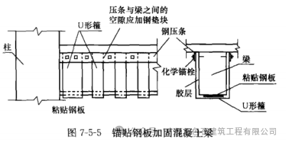 锚贴钢板法系采用结构胶粘剂及锚栓将钢板粘贴于混凝土受弯、大偏心受压或受拉构件的表面,使钢板参与受力,形成整体性的复合截面,以提高构件承载力的一种加固方法(图7-5-5)。为确保长期使用安全,加固后构件的环境温度不应高于60℃。当环境具有腐蚀性介质时,还应有可靠的防护措施。有防火要求时,应按构件耐火等级要求进行防护处理。
