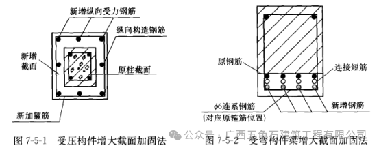 增大截面法系采用与原结构相同的材料增大混凝土结构构件的截面面积,同时增配钢筋,从而提高其承载力、刚度或改变其自振频率的一种直接加固方法。这种方法可广泛用于混凝土结构梁、板、柱、墙体等构件的加固(图7-5-1、图7-5-2)。增大截面法优点是工艺简单、适用范围广;缺点是施工期间建筑结构不能正常使用且周期较长,此外由于增大构件截面,在增加构件自重的同时减少了使用空间。
