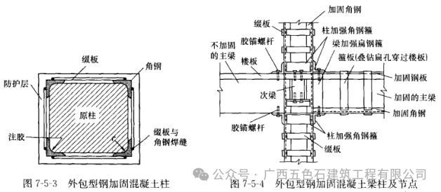 外包钢材法系对钢筋混凝土梁、柱外包型钢、扁钢焊成的构架,并灌注结构胶粘接,以达到构件整体受力,共同约束原构件的加固方法(图7-5-3、图7-5-4)。这种方法适用于使用上不允许增大混凝土截面尺寸,而又需要大幅度地提高承载力和抗震能力的混凝土梁、柱。加固结构的环境温度不应高于60℃;当环境具有腐蚀性介质时,还应有可靠的防护措施。外包钢材法在基本不增大构件截面尺寸的情况下增加构件的延性和刚度,提高了承载力,特别适用于大跨度的受弯或受压结构构件,但加固费用较高。