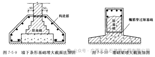 在加固上部结构的同时,如果基础本身承载力不足,地基承载力或变形无法满足安全和正常使用的要求,则应优先采用增大截面法、改变持力层和改变基础类型的方法对基础进行加固。一般增大截面法适用于柱下独立基础、条形基础的加固,通过扩大基础底板面积,可降低地基附加压力达到满足地基承载力和变形的要求(图7-5-9、图7-5-10)。