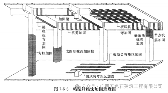 粘贴纤维法是用胶粘剂将纤维布或纤维板等复合材料粘贴到构件需要加强的部位,常用于承受静力作用下的受弯或受拉构件(图7-5-6)。加固时可选用玻璃纤维(GFRP)、芳纶纤维(AFRP)、玄武岩纤维(BFRP)或碳纤维(CFRP)材料。这种方法施工简便、周期短、对环境影响小、加固后不影响结构外观。