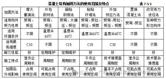 在介绍的上述7种加固方法中,除最后一种方法以外,其他6种方法都称为直接加固法。各种混凝土结构直接加固方法的特点和适用范围如表 7-5-1所示。