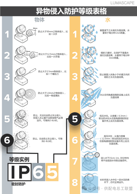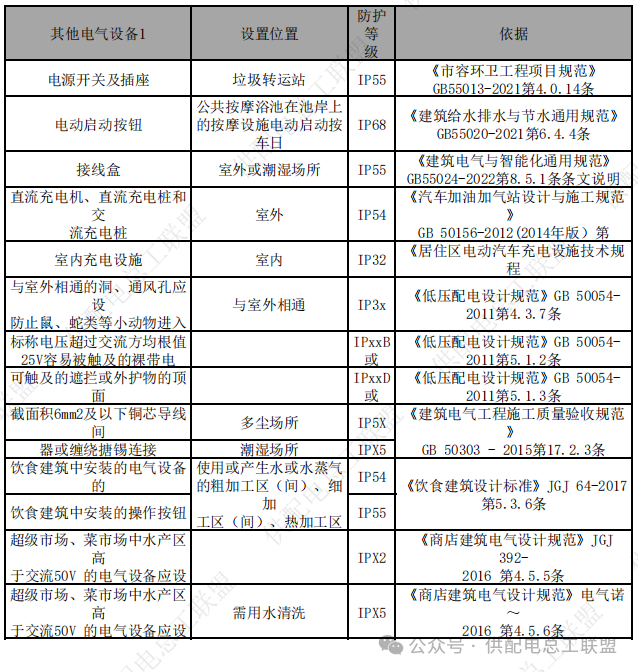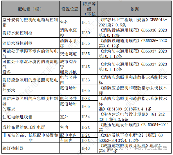 电气设备防护等级IP在工程中较为常用,也容易混淆,小编结合最新通用规范要求,按配电箱(柜)、母线(槽)、照明灯具、其他电气设备等分类汇总如下。