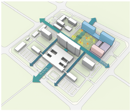 本次新建的医养中心位于太湖县人民医院东北角,为预留发展用地。该项目在开始之前便拥有清晰的顶层设计,以“有机生长,无限融合”为设计理念,在保留原有规划结构的基础上,突出整个院区的医疗轴线。建筑空间秩序则融入现有建筑肌理,通过合院的形式,形成丰富的共享庭院。因老人个人情感方面比较复杂,一方面希望就医方便,另一方面又不希望生活受其干扰。共享庭院的设计为老年人构建了合适的心里缓冲区,给予老年人足够的安全感和归属感。对于建筑功能以及流线方面,将老年医学科置于裙房部分与太湖县人民医院紧密联系,方便资源共享;康复中心位于南侧,方便为医养中心以及人民医院就诊的老人提供康复训练;老年公寓及老年养护位于北侧,相对独立,保证入住老年人的健康安全的同时也提供了充足的阳光和景观视野。整体功能流线均基于现有人民医院的基础上综合考虑,保证人民医院与医养中心既相对独立又相互融合,共同发展。