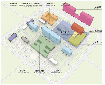 太湖县医养中心位于人民医院内部,用地面积约60亩(40000㎡),总建筑面积65000㎡,容积率1.36。使用功能包含了老年养护、老年病慢病康复治疗、老年病健康管理、老年公寓、行政后勤保障等5大功能板块,共提供700个床位。旨在为当地的老年人提供一处“有所医、有所食、有所住、有所游”的场所。作为太湖县人民医院的扩建项目,本次设计要点不光关注医养中心本身,同时探索如何将现有的医疗机构与新建的养老机构融合,保证其功能互补,流线顺畅。