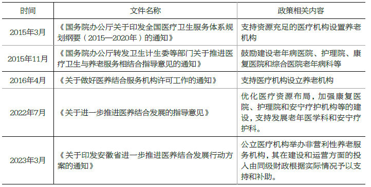 基于人口老龄化趋势,国家出台了一系列相关政策加快推进医养结合模式的发展。2016年,在《关于做好医养结合服务机构许可工作的通知》中,民政部、卫计委等部门明确提出要支持医疗机构设立养老机构。这是在国家层面首次发布支持此类医养结合模式的发展。
