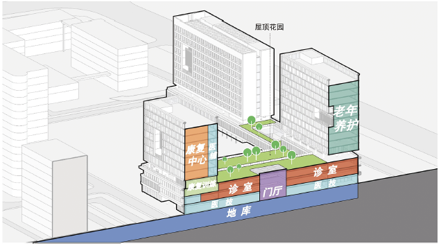 随着近些年来国家在政策上大力扶持医院转型发展医养结合,一些医院为了改善自身的经营现状,提升医院效益等,盲目地发展养老产业。但部分医院在建设之初未预留后期发展条件,盲目的加建或改造建设医养中心反而导致功能、流线等混乱,并不能提供优质的养老环境。同时,混乱的院区环境易造成老年群体的染病概率,也对医院的院内感染控制等工作带来更大的压力。
