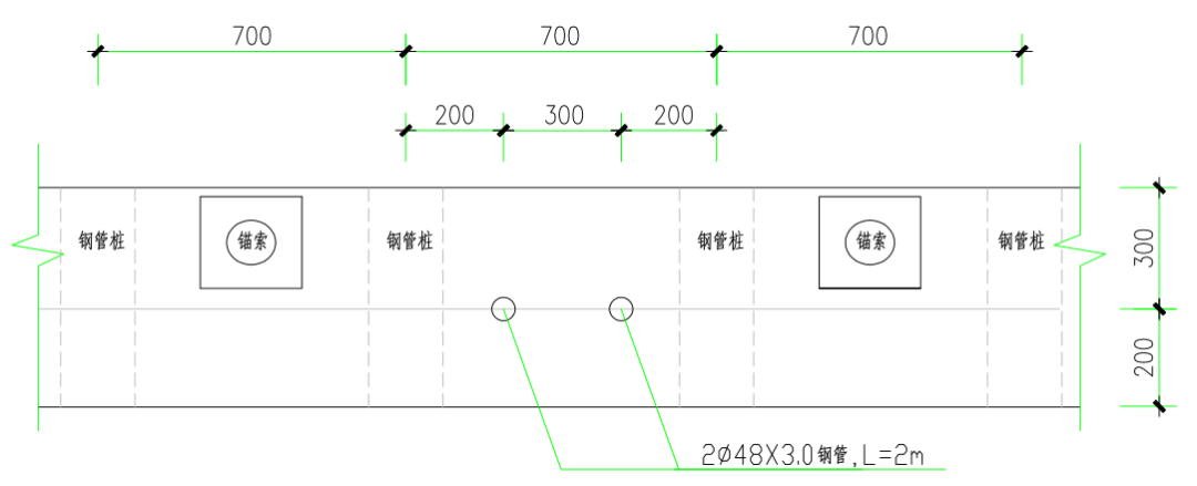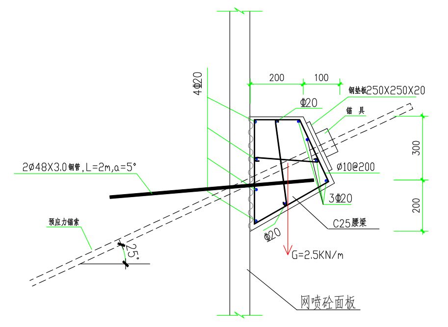 C25混凝土,配筋10?20(Ⅲ级钢)主筋。接近梯形,尺寸底长500mm、顶长450mm、高200mm。腰梁体积约0.1立方米每米。腰梁重量0.1立方米×2.5吨∕立方米﹦2.5KN∕M。锚索间距1.4米,往土中打入2根直径48mm壁厚3.0mm、长度1.7米(总长2.0米)的钢管作支承。