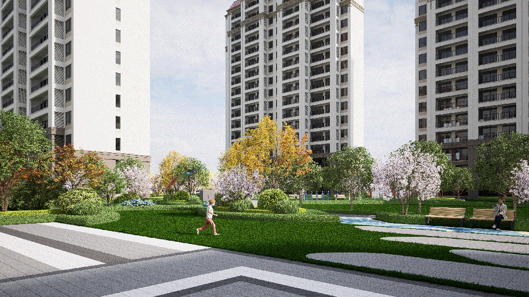 住宅布局规整庄重,形成“两心”、“一环”、“两轴”的规划结构。