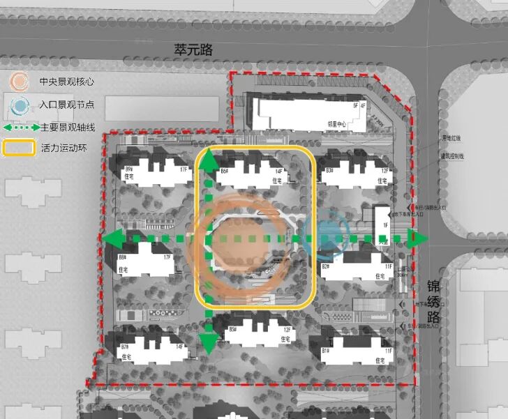 “一环”:利用地上环行消防车道形成活力运动慢跑环。