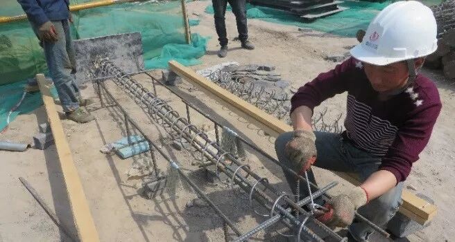 钢筋笼采用6根Φ16主筋与3mm钢托板焊接,钢筋尺寸严格按图纸要求加工,将钢筋笼成品横向架立在特制操作架上完成钢筋笼的箍筋绑扎。