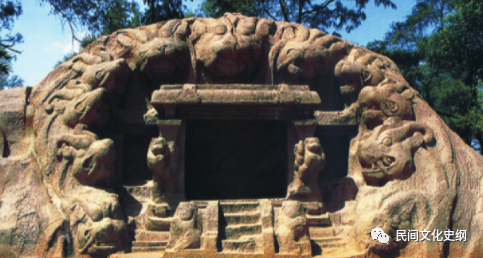 马摩拉普拉姆,建筑已经融化在雕塑中了。在《恒河天降》的周围,尚有许多利用花岗岩岩体凿刻而成的神庙石窟,其中不乏优秀的作品。一座虎窟显示了印度古代艺术家的奇思妙想和挥洒自如的才华。在这里,雕塑与建筑已经分不出界限了。