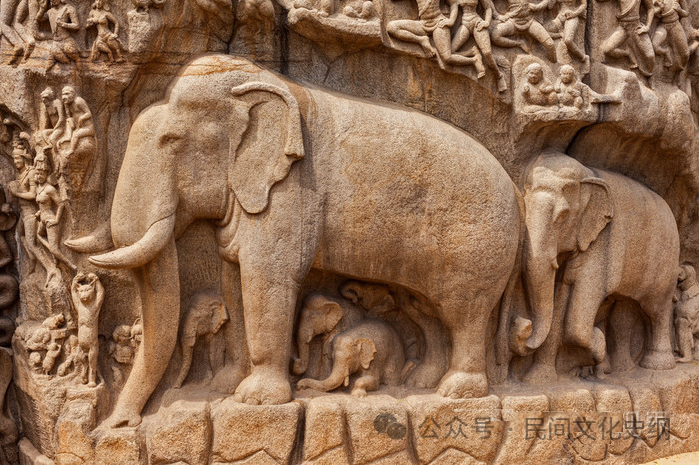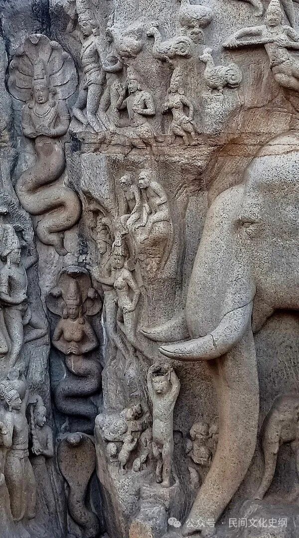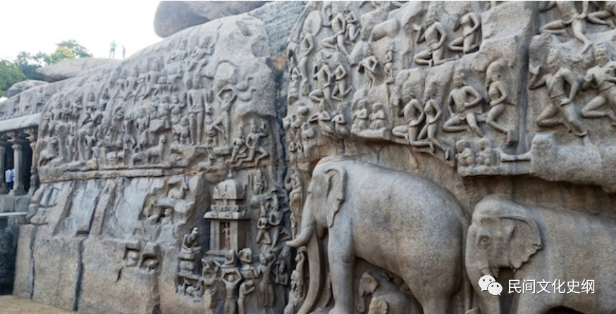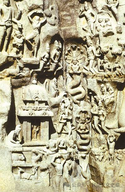 7~8世纪 马摩拉普拉姆,众人物和动物依石形刻制,不加重叠,形象轮廓都很清晰。岩壁中央的一道天然裂缝被用作河水倾泄而下的河道。河水侧旁有瑜伽苦修的幸车王的瘦削形象,旁边是伸手作法指引河水的印度教大神湿婆的雕像。人首蛇身的蛇王夫妇在水中合掌而降。两侧众多的天神、动物,或欢欣奔飞,或顶礼膜拜,热闹非凡。